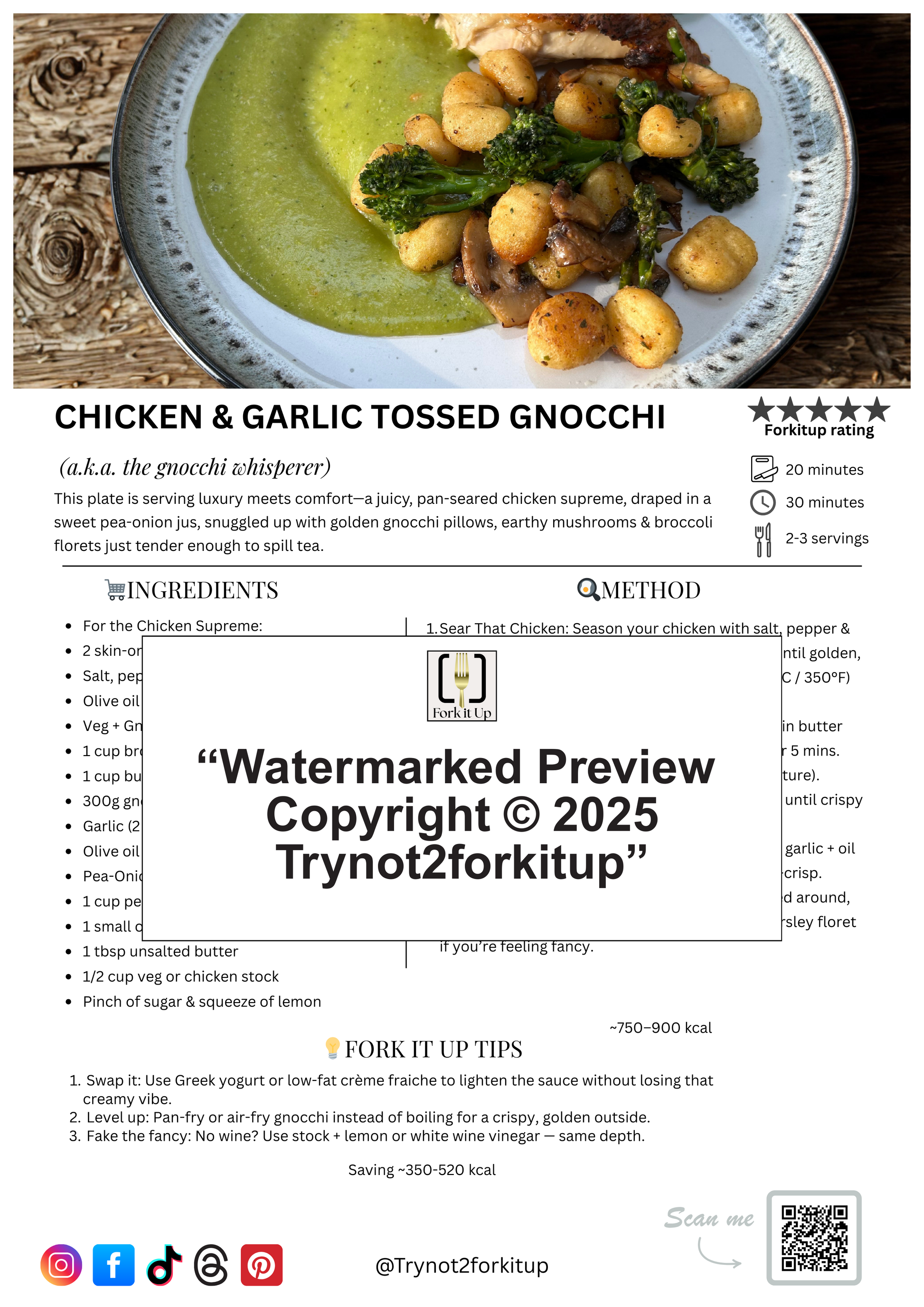 This dish marries luxury with comfort—pan-seared chicken breasts draped in a sweet pea-onion jus, nestled alongside golden, crispy gnocchi pillows, tender mushrooms, and broccoli florets. Each bite delivers warmth and earthy flavors, making it the perfect cozy meal to impress or indulge in any day of the week.