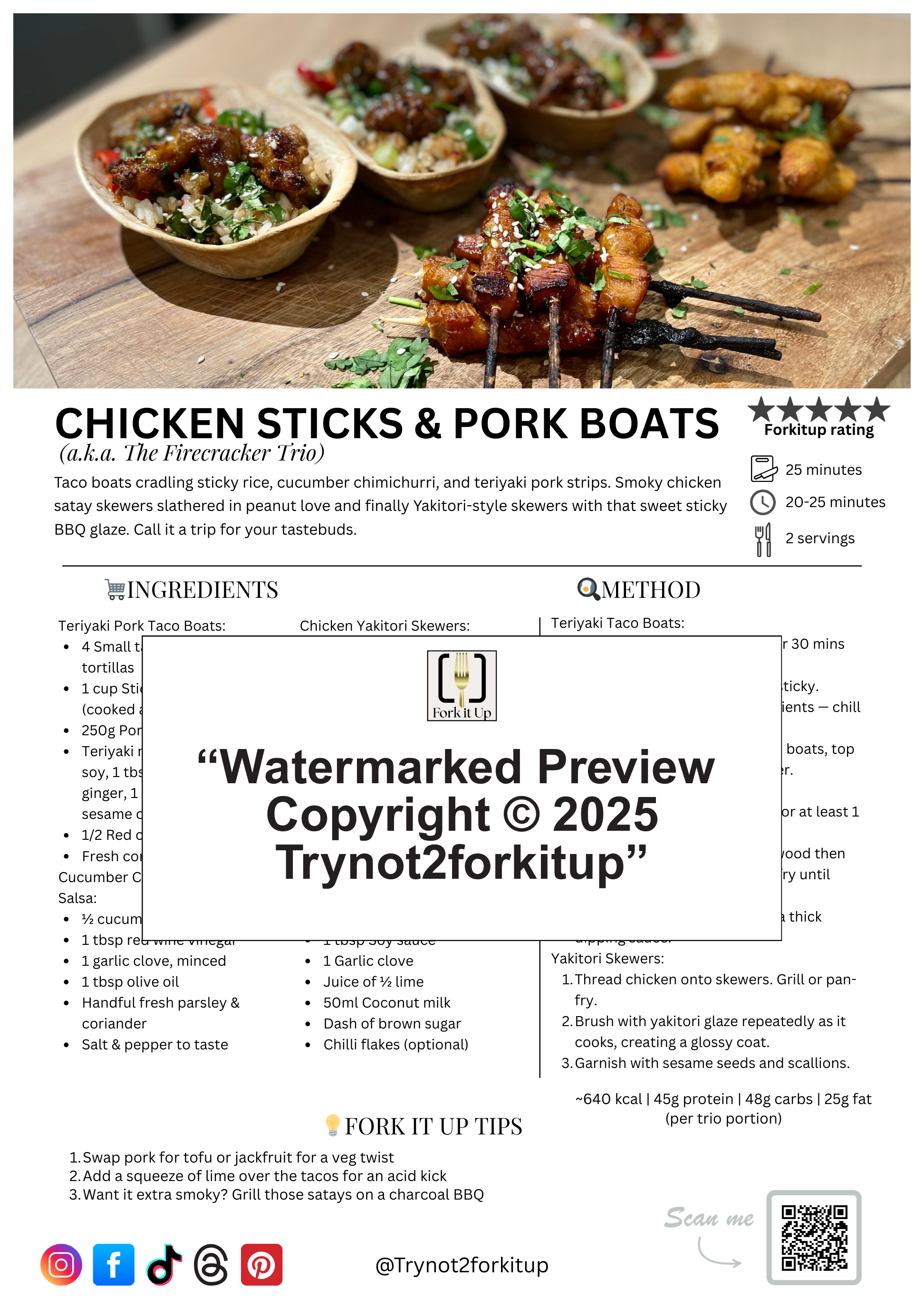 Taco boats loaded with sticky jasmine rice and fresh chimichurri salsa, smoky teriyaki pork strips, and peanut-drenched chicken satay skewers. A triple threat of sweet, spicy, and savory — guaranteed to send your tastebuds on an adventure.