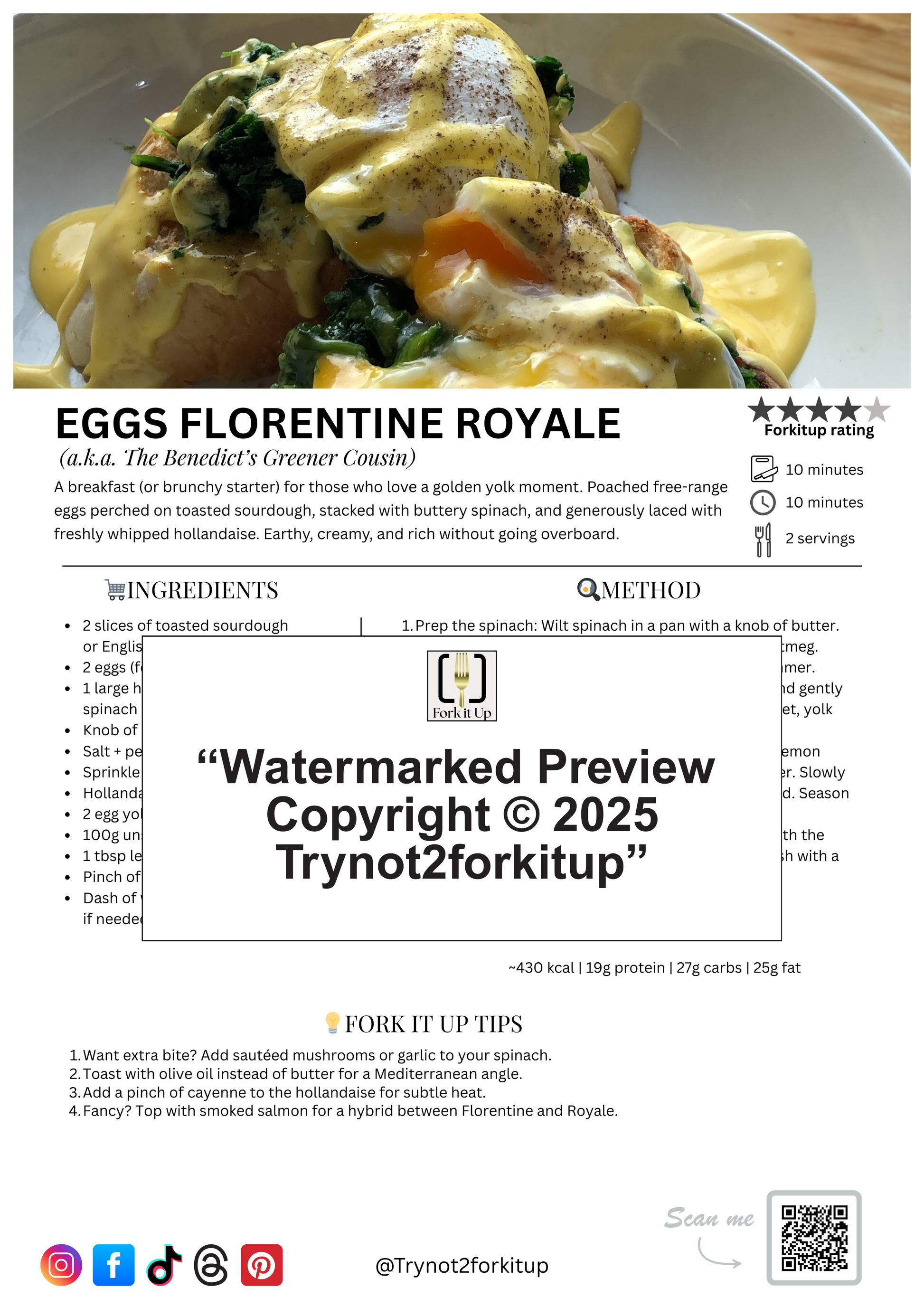 Poached free-range eggs perched on toasted sourdough with buttery spinach, topped with a luscious homemade hollandaise. Earthy, creamy, and balanced — a refined brunch classic with a lighter touch.