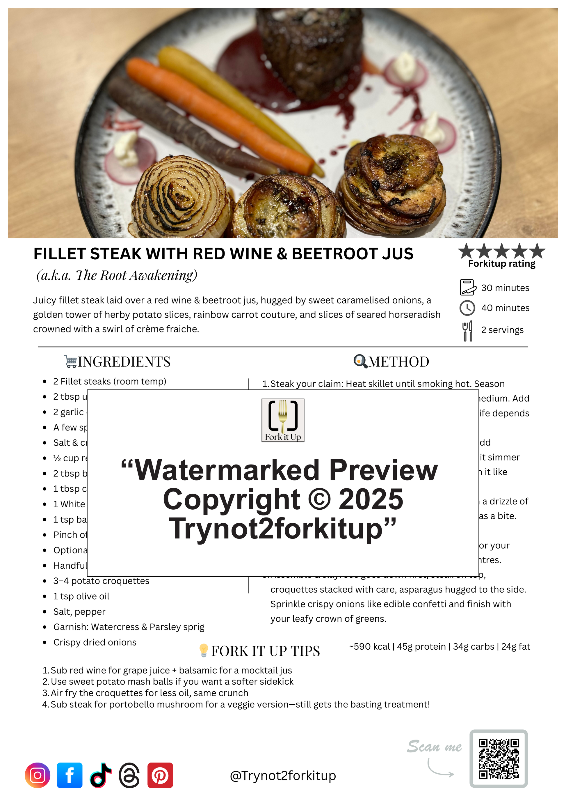 Juicy fillet steak laid over a luscious red wine and beetroot jus, accompanied by sweet caramelized onions and a golden tower of herby potato slices. Finished with rainbow carrots and a swirl of crème fraîche crowned with seared horseradish, this plate is a refined celebration of root-to-plate goodness.