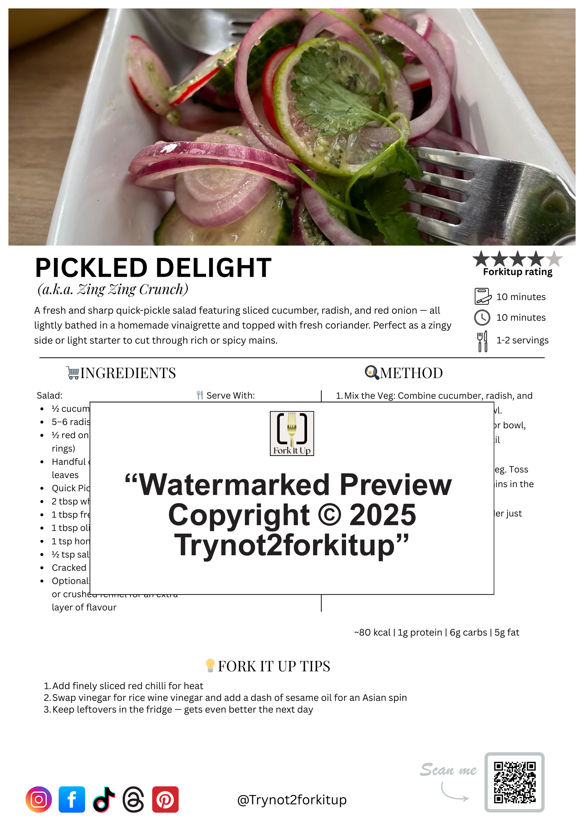 A fresh, sharp quick pickle of cucumber, radish, and red onion bathed in homemade vinaigrette and topped with coriander. Bright, zingy, and perfect as a spicy side or refreshing starter.